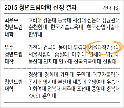 Áö³ 9¿ù 2ÀÏ(È) ¹ßÇ¥ÇÑ µ¿¾ÆÀϺ¸¿Í ä³ÎA, µô·ÎÀÌÆ®ÄÁ¼³ÆÃÀÇ ¡¸2014³â û³âµå¸²´ëÇС¹ Æò°¡°á°ú¿¡¼ ¼¿ï°úÇбâ¼ú´ëÇб³(ÃÑÀå ³²±Ã ±Ù, ÀÌÇÏ ¼¿ï°ú±â´ë)°¡ 2³â ¿¬¼Ó ¡®¿ì¼ö û³âµå¸²´ëÇС¯À¸·Î ¼±Á¤µÆ´Ù.