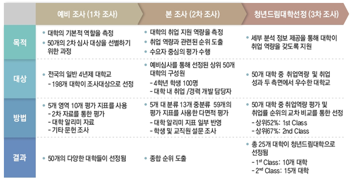 ¿ÃÇØ·Î 3ȸ¸¦ ¸ÂÀº û³âµå¸²´ëÇÐÀº ±³À° ¿©°ÇÀÌ ¿ì¼öÇÑ »óÀ§±Ç ´ëÇÐ ÇлýµéÀÇ Ãë¾÷°ú â¾÷À» ¾ó¸¶³ª È¿À²ÀûÀ̰í Àû±ØÀûÀ¸·Î Áö¿øÇÏ´ÂÁö¸¦ ÁßÁ¡ÀûÀ¸·Î Æò°¡ÇÑ´Ù. ¿ÃÇØ´Â 52°³ 4³âÁ¦ ´ëÇÐÀ» ´ë»óÀ¸·Î »ó´ãÁö¿ø, Á¤º¸Áö¿ø, ±âȸÁö¿ø, ±³°ú°úÁ¤, â¾÷Áö¿ø µî 5°³ Ç׸ñ¿¡ °ÉÃÄ ´ëÇÐÀÇ ÀÎÇÁ¶ó¿Í ÀçÇлýÀÇ ¸¸Á·µµ µîÀ» ÆÄ¾ÇÇØ ÃÖ¿ì¼ö´ëÇÐ 10°÷°ú ¿ì¼ö´ëÇÐ 15°÷À» ¼±Á¤Çß´Ù.