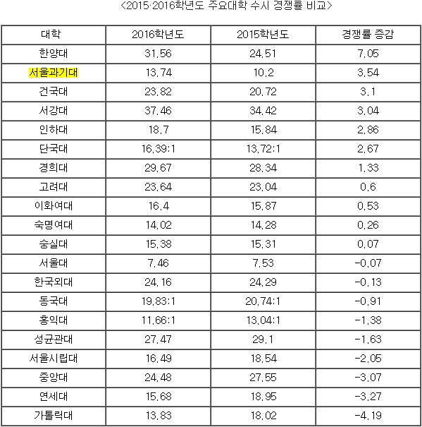 ¼¿ï°úÇбâ¼ú´ëÇб³(ÃÑÀå ³²±Ã ±Ù, ÀÌÇÏ ¼¿ï°ú±â´ë) 2016Çг⵵ ¼ö½Ã¸ðÁý °æÀï·üÀÌ Áö³Çغ¸´Ù Àü¹ÝÀûÀ¸·Î »ó½ÂÇÏ¿´´Ù. Áö³ 9¿ù 9ÀÏ(¼ö)ºÎÅÍ 14ÀÏ(¿ù)±îÁö ¼ö½Ã¸ðÁý ¿ø¼Á¢¼ö¸¦ ¸¶ÃÆÀ¸¸ç 1,463¸í ¸ðÁý¿¡ 20,103¸íÀÌ Áö¿øÇÏ¸é¼ 13.74:1ÀÇ °æÀï·üÀ» ±â·ÏÇß´Ù. ÀÌ´Â Áö³ÇØ °æÀï·ü 10.20:1º¸´Ù ³ôÀº ¼öÄ¡ÀÌ´Ù.