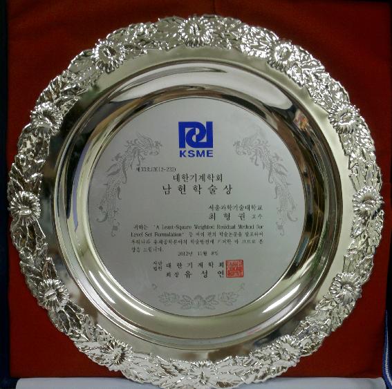 ±â°è¤ýÀÚµ¿Â÷ °øÇаú ÃÖÇü±Ç ±³¼ö´Â Áö³ 11¿ù8ÀÏ ´ëÇѱâ°èÇÐȸ Ãß°èÇмú´ëȸ¿¡¼ ¡®A Least-Square Weighted Residual Method for Level Set Formulation' µî ¿©·¯ ÆíÀÇ Çмú³í¹®À» ¹ßÇ¥ÇÏ¿© À¯Ã¼°øÇкоßÀÇ Çмú¹ßÀü¿¡ ±â¿©ÇÑ ¹Ù°¡ Ä¿ ³²Çå Çмú»óÀ» ¼ö»óÇß´Ù. 1993³â¿¡ Á¦Á¤µÈ ³²ÇåÇмú»óÀº ¿ ¹× À¯Ã¼°øÇко߿¡¼ Ź¿ùÇÑ ¾÷ÀûÀ¸·Î Çй®¹ßÀü¿¡ ±â¿©ÇÑ ÀÚ¸¦ ¼±Á¤ÇÏ¿© Æ÷»óÇϸç, ¼ö»óÀÚ´Â ´ëÇѱâ°èÇÐȸ Á¤È¸¿øÀ¸·Î¼ ¼ö»ó¿¬µµ Àü 5³â À̳»¿¡ ´ëÇѱâ°èÇÐȸ³í¹®Áý(±¹․¿µ¹®) ¹× ±¹³»¤ý¿Ü ÇмúÁö¿¡ °ÔÀçµÈ ¿ ¹× À¯Ã¼°øÇкоßÀÇ ³í¹®ÀúÀÚ Áß¿¡¼ Ź¿ùÇÑ ÀÚ·Î Á¤ÇÑ´Ù.