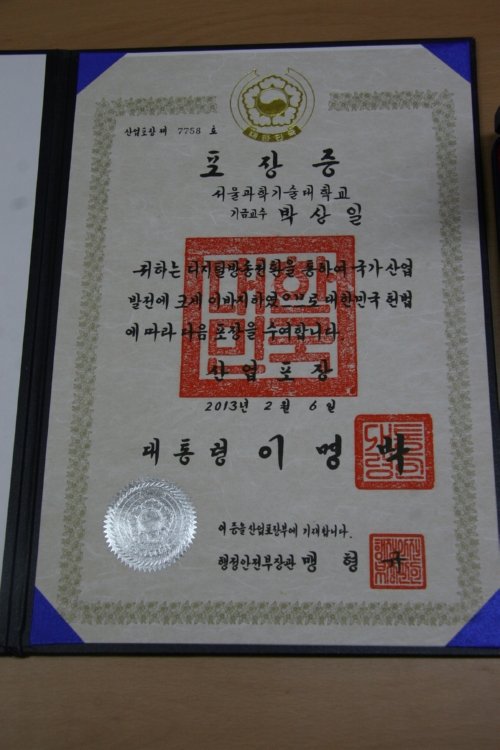 ÀüÀÚIT¹Ìµð¾î°øÇаúÀÇ ¹Ú»óÀÏ ±³¼ö°¡ Áö³ 2¿ù 6ÀÏ À̸í¹Ú ´ëÅë·ÉÀ¸·ÎºÎÅÍ Ç¥Ã¢Àå°ú »ê¾÷ Æ÷Àå ÈÆÀåÀ» ¼öÈÆÇÏ¿´´Ù. À̹ø ¹Ú±³¼öÀÇ Ç¥Ã¢Àº 2003³â »ï¼ºÀüÀÚ Àü¹«½ÃÀý µðÁöÅ»¹æ¼Û¹æ½Ä ¼±Á¤½Ã ¼ö°íÇÑ ¾÷Àû°ú 2009³â ºÎÅÍ ¹æÅëÀ§ PMÀ¸·Î »õ·Î¿î 3D¹æ¼Û¹æ½ÄÀ» Á¦¾ÈÇØ Çѱ¹Ç¥Áذú ¼¼°èÇ¥ÁØÀÎ ¹Ì±¹ATSCÇ¥ÁØ¿¡ ±îÁö ¼±Á¤½ÃŲ °øÀûÀ» ÀÎÁ¤¹ÞÀº °ÍÀÌ´Ù.