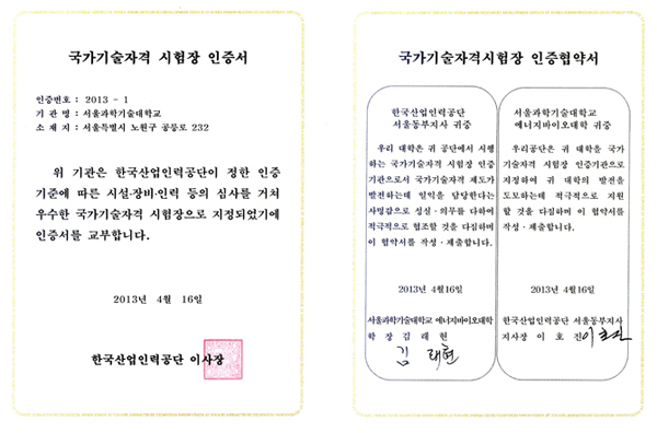 ¼¿ï°úÇбâ¼ú´ëÇб³ ¿¡³ÊÁö¹ÙÀÌ¿À´ëÇРȰø»ý¸í°øÇаú´Â 2013³â 4¿ù 16ÀÏ(È) Çѱ¹»ê¾÷Àη°ø´ÜÀ¸·ÎºÎÅÍ È°ø±â»ç ¹× ÈÇкм®±â»ç Á¾¸ñ¿¡ ´ëÇÏ¿© ±¹°¡±â¼úÀÚ°Ý ÀÎÁõ½ÃÇèÀåÀ¸·Î °øÀÎ ¹Þ¾Ò´Ù. 2°³ Á¾¸ñÀº ³â 4ȸ¿¡ °ÉÃÄ 1ÀÏ ¾à 32¸íÀÌ 2°³½Ç¿¡¼ ±¹°¡±â¼úÀڰݰËÁ¤ ½Ç±â½ÃÇèÀ» ½Ç½ÃÇÑ´Ù. ±è·¡Çö ¿¡³ÊÁö¹ÙÀÌ¿À´ëÇÐÀåÀ» ºñ·ÔÇÏ¿© Á¤°Ç¿ë Ȱø»ý¸í°øÇаú ÇаúÀå ¹× Çаú±³¼ö, Çѱ¹»ê¾÷Àη°ø´Ü ¼¿ïµ¿ºÎÁö»ç ÀÌÈ£Áø Áö»çÀå°ú ÀÌÈ¿µ¿ ÀÚ°ÝÆò°¡Àå µî 10¿©¸íÀÌ Âü¼®ÇßÀ¸¸ç, ÇöÆÇ½ÄÀº û¿î°ü ÀÔ±¸¿¡¼ ½Ç½ÃµÇ¾ú´Ù.