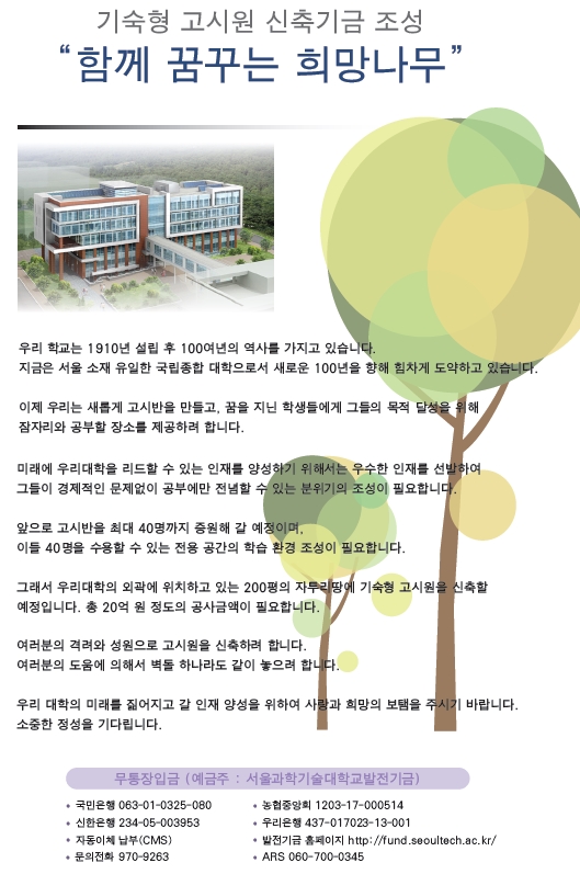 ´ã´çºÎóÀÎ (Àç)¼¿ï°úÇбâ¼ú´ë ¹ßÀü±â±ÝÀÇ Ãß¼±°æ ÁÖ¹«°üÀº ¡°±â¼÷Çü °í½Ã¿øÀ» ÅëÇØ, ¿ì¸®´ëÇÐ Ãâ½ÅÀÇ Ç°°Ý ÀÖ´Â ÀÎÀ縦 ¾ç¼ºÇϰí, ¿ì¸®´ëÇÐÀÇ ¹Ì·¡¸¦ À̲ø¾î °¥ °æÀï·ÂÀ» È®º¸ÇÒ °Í¡±À̶ó¸ç ¡°À̸¦ Áö¿øÇϱâ À§ÇØ °øºÎ¿Í ¼÷½Ä µîÀ» µ¿ÀÏ Àå¼Ò¿¡¼ ÇØ°áÇÒ ¼ö Àִ ȯ°æÀ» Á¦°øÇϰíÀÚ ÇÑ´Ù¡±°í »ç¾÷ÃëÁö¸¦ ¹àÇû´Ù.
