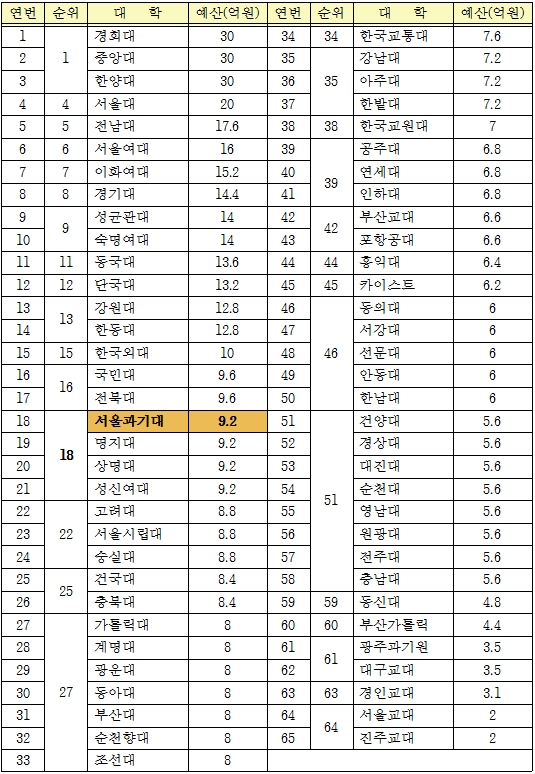 ÇÑÆí ÃÖÁ¾ 65°³ ´ëÇÐÀ» ¼±Á¤ÇÑ À̹ø »ç¾÷Àº ÃÑ 133°³ÀÇ 4³âÁ¦ ´ëÇÐÀÌ ½ÅûÇÏ¿© ³ôÀº °ü½ÉÀ» º¸ÀÎ ¹Ù ÀÖÀ¸¸ç, »ç¾÷ºñ´Â ÃÖ´ë 30¾ï¿ø¿¡¼ ÃÖ¼Ò 2¾ï¿ø ±îÁö Â÷µî ¹èÁ¤µÆ´Ù.