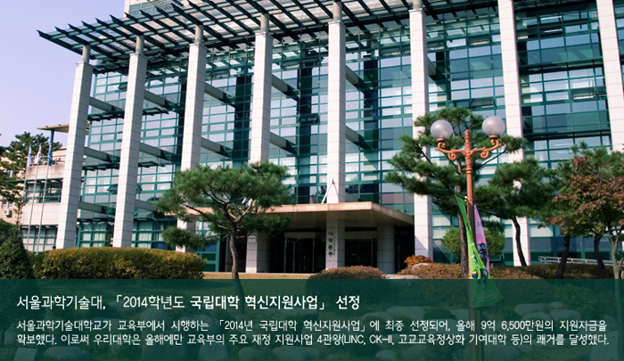 ¼¿ï°úÇбâ¼ú´ëÇб³(ÃÑÀå ³²±Ã ±Ù, ÀÌÇÏ ¼¿ï°ú±â´ë)°¡ ±³À°ºÎ¿¡¼ ½ÃÇàÇÏ´Â ¡¸2014³â ±¹¸³´ëÇÐ Çõ½ÅÁö¿ø»ç¾÷¡¹¿¡ ÃÖÁ¾ ¼±Á¤µÇ¾î, ¿ÃÇØ 9¾ï 6,500¸¸¿øÀÇ Áö¿øÀÚ±ÝÀ» È®º¸Çß´Ù. ¼¿ï°ú±â´ë´Â ±Ý³âµµ ¡ã2´Ü°è »êÇÐÇù·Â¼±µµ´ëÇÐ(LINC) À°¼º»ç¾÷ ¡ã°í±³±³À° Á¤»óÈ ±â¿©´ëÇÐ Áö¿ø»ç¾÷ ¡ã´ëÇÐÆ¯¼ºÈ¸¦ À§ÇÑ CK(University for Creative Korea)»ç¾÷¿¡ ÀÌ¾î ±³À°ºÎÀÇ ÁÖ¿ä ÀçÁ¤ Áö¿ø»ç¾÷¿¡ ¿¬¼Ó ¼±Á¤µÇ´Â Äè°Å¸¦ ´Þ¼ºÇß´Ù.
