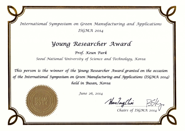 ±â°è½Ã½ºÅÛµðÀÚÀΰøÇаú ¹Ú±Ù ±³¼ö°¡ Áö³ 6¿ù 26ÀÏ, ºÎ»ê¿¡¼ °³ÃÖÇÑ ±¹Á¦ÇÐȸÀÎ International Symposium on Green Manufacturing and Applications (ISGMA 2014)¿¡¼ Young Researcher Award¸¦ ¼ö»óÇß´Ù.