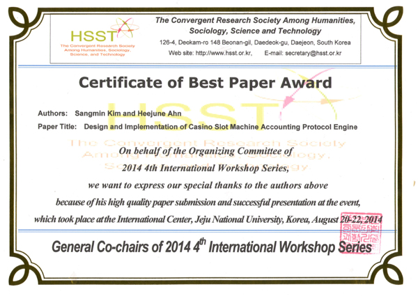 Çѱ¹ÄÄÇ»ÅͰÔÀÓÇÐȸ¿Í HSSTÇÐȸ°¡ °øµ¿°³ÃÖÇÑ 2014³âµµ HSST ±¹Á¦ Çмú´ëȸ(Á¦ÁÖµµ 2014³â8¿ù20ÀÏ-22ÀÏ)¿¡¼ ¿ì¸®´ëÇÐ ±è»ó¹Î (ÀϹݴëÇпø, Àü±âÁ¤º¸°øÇаú, ¼®»ç°úÁ¤) ¾¾¿Í ¾ÈÈñÁØ ±³¼ö (Àü±âÁ¤º¸°øÇаú) °¡ ¹ßÇ¥ÇÑ "Design and Implementation of Casino slot machine accounting protocol engine" ÀÌ Best Paper »óÀ» ¼ö»óÇß´Ù.