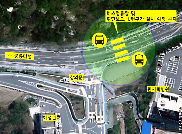¼¿ï°úÇбâ¼ú´ëÇб³ÀÇ µ¿ÂÊ ´ë·Îº¯¿¡ ³ªÀÖ´Â ¡¸Ã¢Àǹ®(ÈĹ®)¡¹ ¾Õ¿¡ Ⱦ´Üº¸µµ¿Í ¹ö½ºÁ¤·ùÀåÀÌ ¼³Ä¡µÈ´Ù. Áö³ 5¿ù 7ÀÏ(¸ñ) ¼¿ïÁö¹æ°æÂûû ½ÉÀDZÔÁ¦À§¿øÈ¸ÀÇ ½ÉÀǰá°ú, âÀǹ® ±Ùó¿¡ Ⱦ´Üº¸µµ ¹× UÅÏ ±¸°£À» ¼³Ä¡Çϱâ·Î °áÁ¤Çѵ¥ À̾î, 6¿ù 2ÀÏ(È) ¼¿ï½Ã·ÎºÎÅÍ ¼³°è¿Ï·á ¹× ¼³Ä¡ Å뺸¸¦ ¹Þ¾Ò´Ù. ÀÌ¿¡ µû¶ó 7¿ù Áß ½ÅÈ£µî°ú Ç¥ÁöÆÇ µî ±³Åë½Ã¼³¹°ÀÌ Àü¸é ±³Ã¼¡¤¼³Ä¡µÈ´Ù.