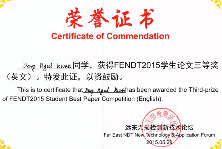 ¼¿ï°úÇбâ¼ú´ëÇб³ ±â°è¡¤ÀÚµ¿Â÷°øÇаú ºñÆÄ±«Æò°¡¿¬±¸½ÇÀÇ ¹Ú»ç°úÁ¤ °ûµ¿¿ ¿¬±¸¿ø(Áöµµ±³¼ö ¹ÚÀͱÙ)ÀÌ Áö³ 5¿ù 28ÀÏ(¸ñ)ºÎÅÍ 31ÀÏ(ÀÏ) 4Àϰ£ Áß±¹ Zhuhai¿¡¼ °³ÃÖµÈ ±¹Á¦ ÄÁÆÛ·±½º ¡¸2015 FENDT Conference(2015 IEEE 12th Far East Forum on Nondestructive Evaluation and Testing)¡¹¿¡¼ ¿ì¼ö³í¹®»ó(Student Best Paper Competition)À» ¼ö»óÇÏ¿´´Ù.